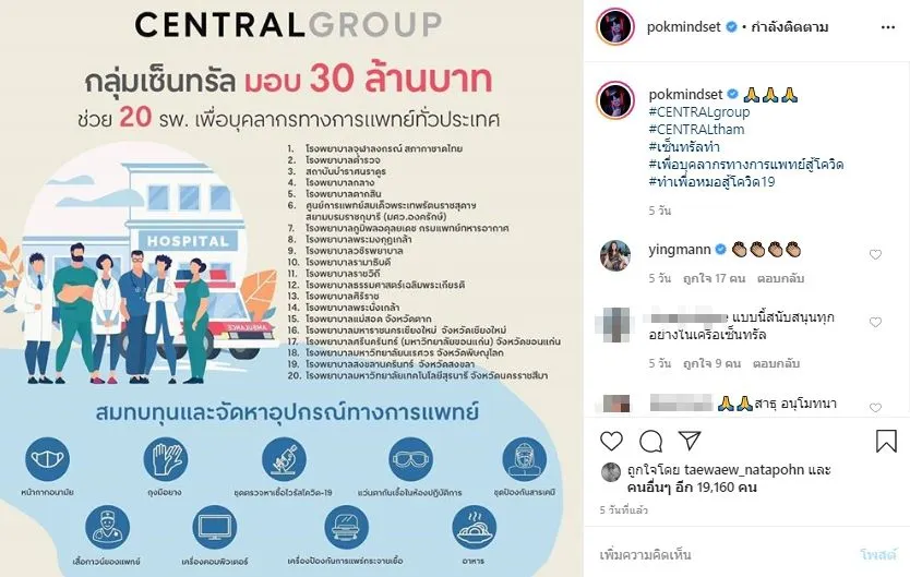 และต้องบอกเลยว่าแม้ขณะนี้ประเทศไทยกำลังประสบกับปัญหาร้ายๆอยู่นั้น แต่ต้องบอกเลยว่ายังมีสิ่งดีๆที่เกิดขึ้นให้เห็นนั้นก็คือการร่วมตัวเป็นหนึ่งเดียวร่วมกับบริจาคเงิน สิ่งของ ที่จำเป็นให้กับทีมแพทย์ พยาบาล เพื่อช่วยเหลือผู้ป่วย ซึ่งก็มีเหล่าบรรดาดาราศิลปินหลายท่านที่ออกมาเป็นแกนนำการทำครั้งดีในครั้งนี้