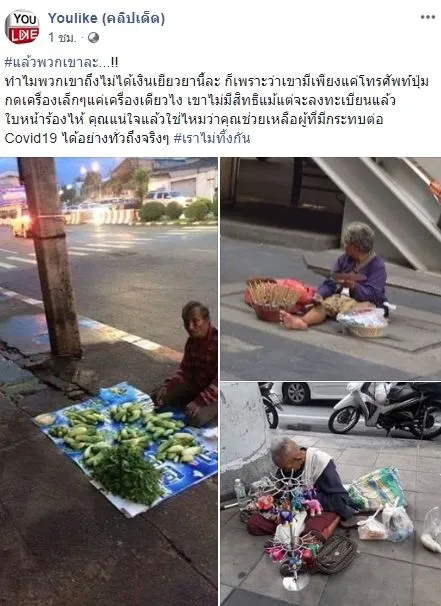 ล่าสุดที่เพจ Youlike (คลิปเด็ด) ได้มีการโพสต์รูปภาพพร้อมทั้งระบุข้อความว่า..#แล้วพวกเขาละ ทำไมพวกเขาถึงไม่ได้เงินเยียวยานี้ละ ก็เพราะว่าเขามีเพียงแค่โทรศัพท์ปุ่มกดเครื่องเล็กๆแค่เครื่องเดียวไง เขาไม่มีสิทธิแม้แต่จะลงทะเบียนแล้ว ใบหน้าร้องไห้ คุณแน่ใจแล้วใช่ไหมว่าคุณช่วยเหลือผู้ที่มีกระทบต่อ Covid19 ได้อย่างทั่วถึงจริงๆ #เราไม่ทิ้งกัน