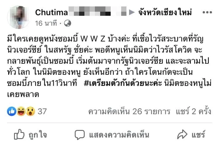 สาวลั่นเห็นนิมิตว่า "ไวรัสโควิต 19" จะกลายพันธุ์เป็นซอมบี้แบบหนัง world war z