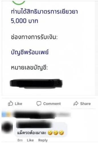 โดยพบว่าผู้ใช้เฟสบุ๊คบางคน ได้โพสต์อวดยอดเงินช่วยเหลือ ล่าสุดเป็นหนุ่มรายหนึ่งคุยกับคนรู้จักในเฟสบุ๊คว่า ตนได้รับเงินแล้ว และเตรียมไปดื่มให้เละในวันพรุ่งนี้