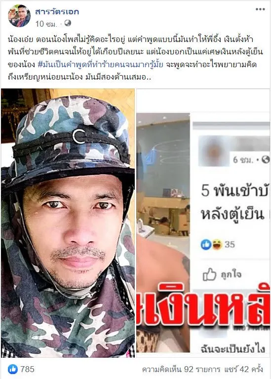 เงินตั้งห้าพันที่ช่วยชีวิตคนจนให้อยู่ได้เกือบปีเลยนะ แต่น้องบอกเป็นแค่เศษเงินหลังตู้เย็นของน้อง มันเป็นคำพูดที่ทำร้ายคนจนมากรู้มั้ย จะพูดจะทำอะไรก็คิดถึงเหรียญหน่อยนะน้อง มันมีสองด้านเสมอ ทำให้ชาวโซเชียลเข้ามาแสดงความคิดเห็นเป็นจำนวนมาก"