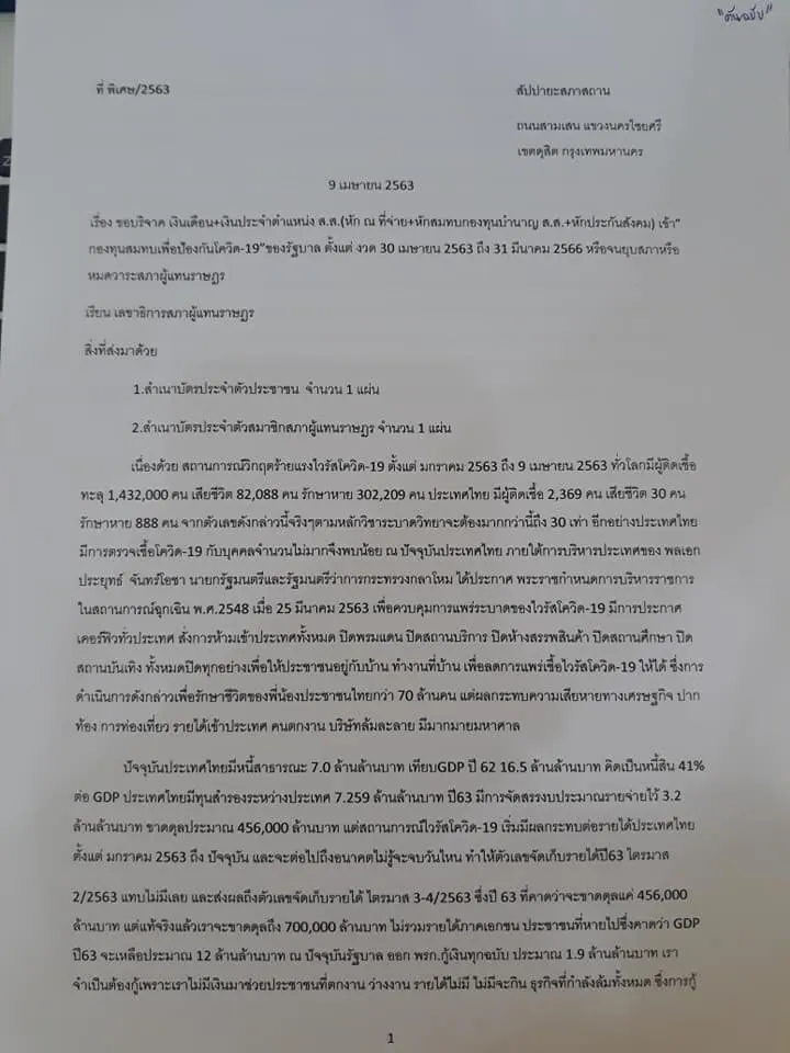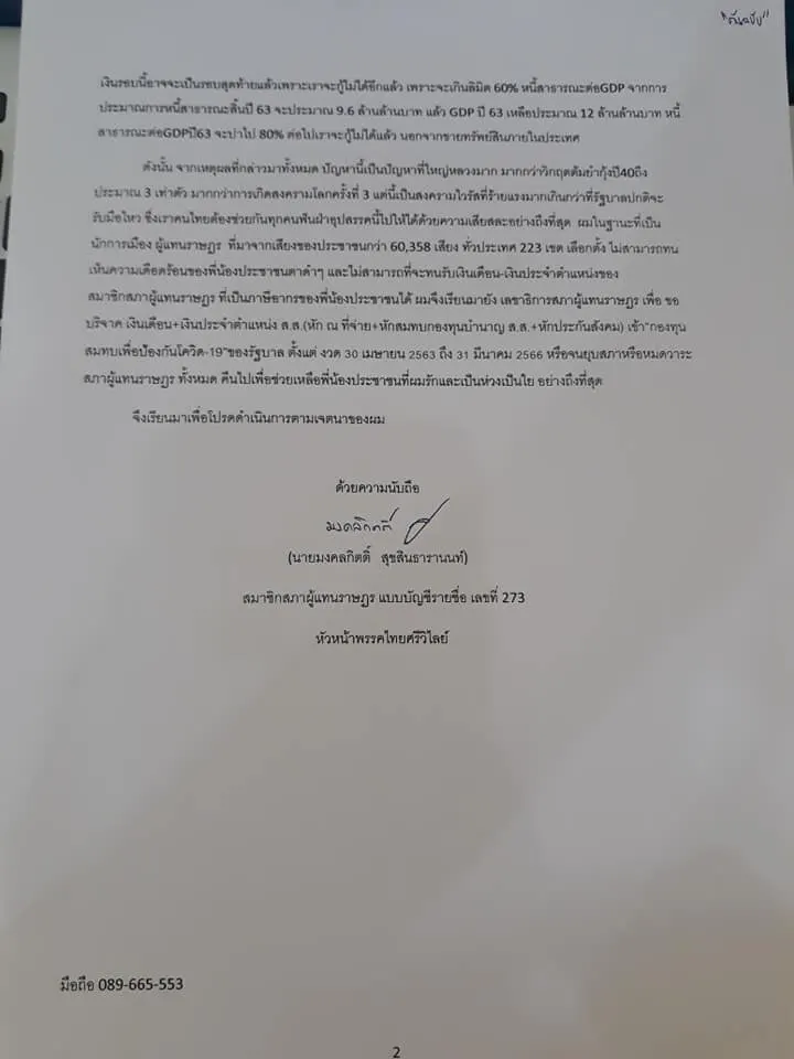 "มงคลกิตติ์ สุขสินธารานนท์ "ยินดีให้สำนักงานเลขาธิการสภาผู้แทนราษฏร หักเงินเดือน และ เงินประจำตำแหน่ง สมทบกองทุนแก้ไขปัญหาโควิด-19