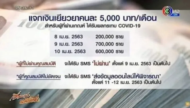 โดยเมื่อ 7 เมษายน ที่ผ่านมา นายอุตตม สาวนายน รมว.คลัง ได้แถลงผลการประชุมครม. ถึงมาตรการดูแลผู้ได้รับผลกระทบ เปิดเผย ว่ามาตรการจ่ายเงินให้ผู้ได้รับผลกระทบจากคนละ 5,000 บาท เป็นเวลา 3 เดือน ระหว่างเดือนเมษายน ถึง เดือนมิถุนายนนั้น