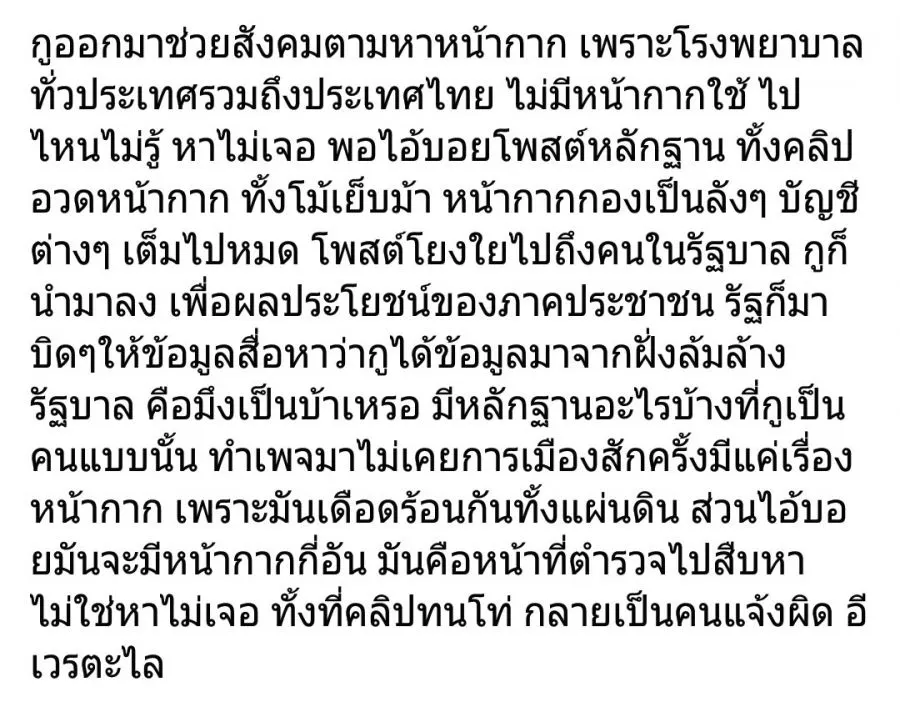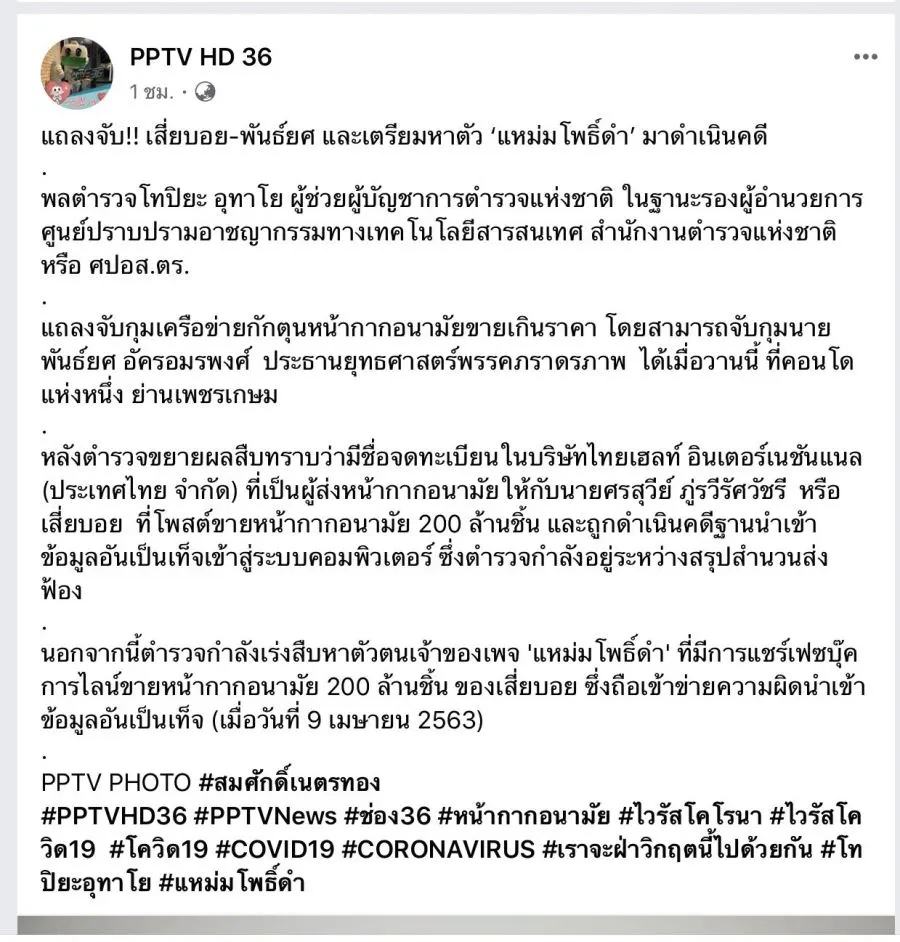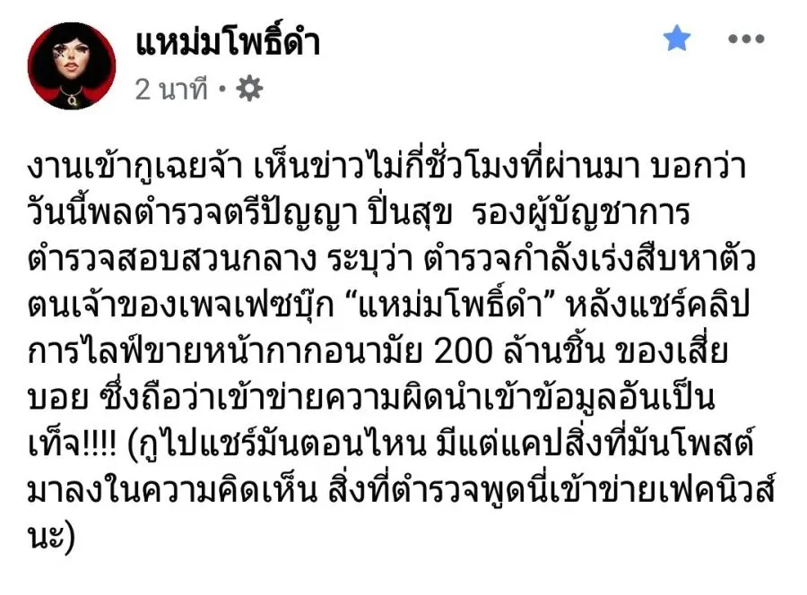 ข้อมูลที่แหม่มโพธิ์ดำโพสว่านายบอยค้าหน้ากากเป็นข้อมูลอันเป็นเท็จ ขณะนี้ตำรวจกำลังสืบสวนว่าแหม่มโพธิ์ดำเป็นใครนะครับ