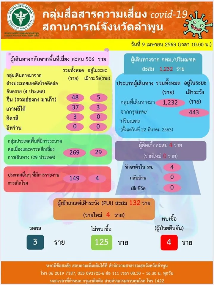 จังหวัดลำพูนไม่พบผู้ติดเชื้อ เพิ่ม ยังคงมีผู้ติดเชื้อสะสม 4 ราย ทั้ง 4 รายยังอยู่ในโรงพยาบาล และมี รอผลตรวจเชื้ออีก 3 ราย