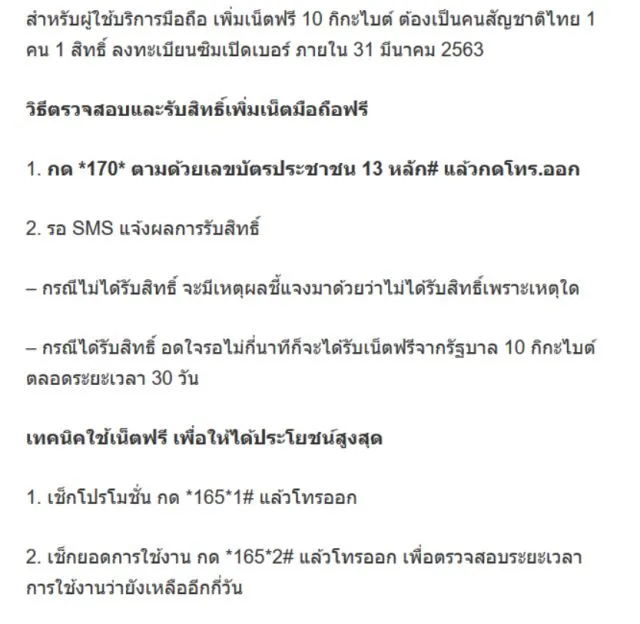 สำหรับผู้ใช้บริการมือถือ เพิ่มเน็ตฟรี 10 กิกะไบต์ ต้องเป็นคนสัญชาติไทย 1 คน 1 สิทธิ์ ลงทะเบียนซิมเปิดเบอร์ ภายใน 31 มีนาคม 2563 วิธีตรวจสอบและรับสิทธิ์เพิ่มเน็ตมือถือฟรี