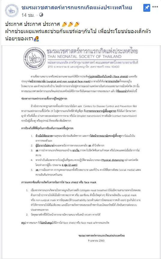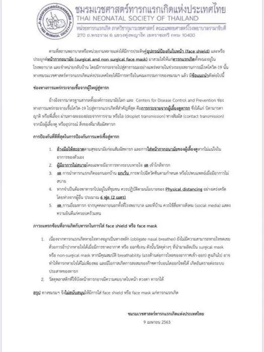 ชมรมเวชศาสตร์ทารกแรกเกิดแห่งประเทศไทย ได้ออกประกาศ เรื่องอุปกรณ์ป้องกันใบหน้า ( face shield) หรือ การประยุกต์หน้ากากอนามัย สวมใส่ให้กับเด็กแรกเกิดทั้งขณะอยู่ที่ รพ. และ กลับบ้าน ชมรมเวชศาสตร์ทารกแรกเกิดแห่งประเทศไทย จึงได้หารือ