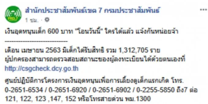 ล่าสุด เมื่อวันที่ 10 เมษายน 63 เพจ สำนักประชาสัมพันธ์เขต 7 กรมประชาสัมพันธ์ ก็ได้โพสต์ข้อความระบุว่า เงินอุดหนุนบุตร 600 บาท โอนวันนี้