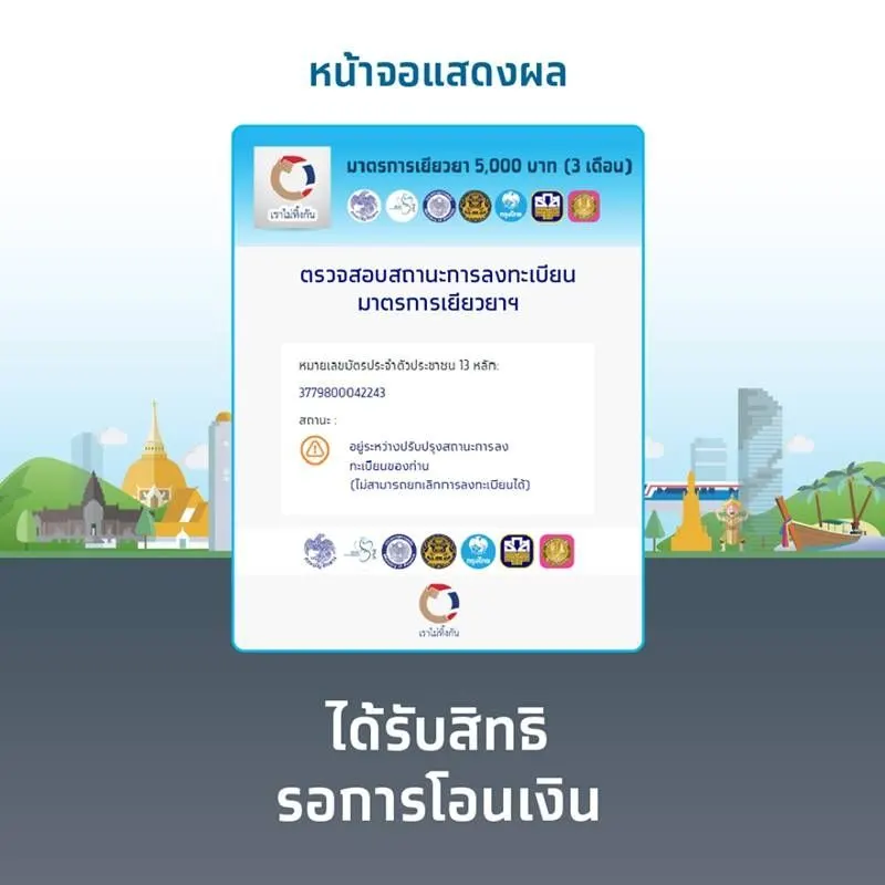 1. หากขึ้นสถานะ อยู่ระหว่างปรับปรุงสถานะการลงทะเบียนของท่าน (ไม่สามารถยกเลิกการลงทะเบียนได้) แปลว่า ท่านได้รับสิทธิ์ เราไม่ทิ้งกัน ให้รอการโอนเงินได้เลย