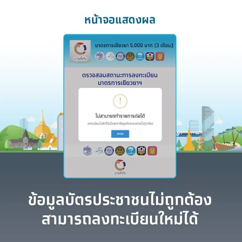 3.หากขึ้นสถานะ ไม่สามารถทำรายการต่อได้ ลงทะเบียนไม่สำเร็จเนื่องจากข้อมูลบัตรประชาชนไม่ถูกต้อง แปลว่า ข้อมูลในบัตรประชาชนของท่านไม่ถูกต้อง ขอให้ท่านลงทะเบียนใหม่ โดยตรวจสอบข้อมูลเหล่านี้ไห้ดี และครบถ้วน คือ