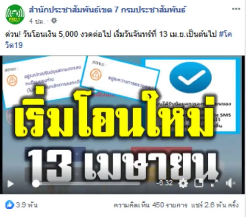 ล่าสุดเพจเฟสบุ๊คที่ใช้ชื่อว่า สำนักประชาสัมพันธ์เขต 7 กรมประชาสัมพันธ์ โดยได้ระบุข้อความว่า 8 ล้านคน มีโอกาสสูง รับเงิน 5,000