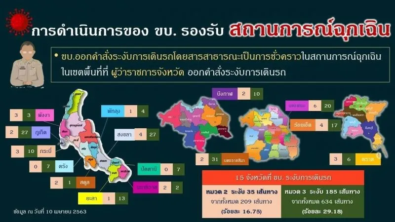 นายจิรุตม์ กล่าวต่อว่า สำหรับการดำเนินการของกรมการขนส่งทางบก เพื่อรองรับสถานการณ์ฉุกเฉินนั้น โดยได้ออกคำสั่งระงับการเดินรถโดยสารสาธารณะเป็นการชั่วคราว ในสถานการณ์ฉุกเฉินในเขตพื้นที่ ที่ผู้ว่าราชการจังหวัดออกคำสั่งระงับการเดินรถ รวม 15 จังหวัด ประกอบด้วย หมวด 2 ระงับ 35 เส้นทาง จากทั้งหมด 209 เส้นทาง หรือคิดเป็น 16.75% ได้แก่ พังงา 3 เส้นทาง, ภูเก็ต 2 เส้นทาง, กระบี่ 3 เส้นทาง, สตูล 2 เส้นทาง, ยะลา 1 เส้นทาง, พัทลุง 1 เส้นทาง, สงขลา 4 เส้นทาง, นราธิวาส 2 เส้นทาง, บึงกาฬ 2 เส้นทาง, นครราชสีมา 2 เส้นทาง, นครพนม 6 เส้นทาง, ร้อยเอ็ด 4 เส้นทาง และตราด 3 เส้นทาง