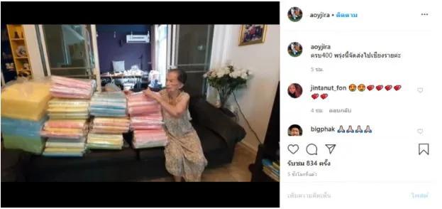 ทั้งนี้ คุณอ้อย จิระวดี ลูกสาว ได้โพสต์คลิปคุณแม่ที่นั่งอยู่ข้างๆ กับเฟซชีลด์ล็อตใหญ่ ระบุข้อความว่า ครบ 400 พรุ่งนี้จัดส่งไปเชียงรายค่ะ