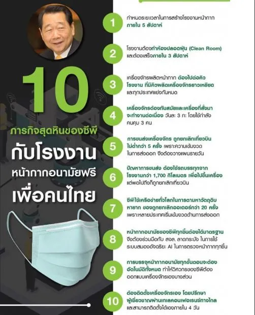 จากที่ก่อนหน้านี้ นายธนินท์ เจียรวนนท์ ประธานอาวุโสซีพี ประกาศลงทุน 100 ล้านบาท และขอเวลา 5 สัปดาห์ เพื่อสร้างโรงงานผลิตหน้ากากอนามัยแจกฟรี ให้กับบุคลากรทางการแพทย์ และประชาชนที่ขาดแคลน ล่าสุด วันที่ 9 เม.ย. 63 ที่ผ่านมา นายธนินท์ เจียรวนนท์ ประธานอาวุโส เครือเจริญโภคภัณฑ์ ให้สัมภาษณ์สื่อมวลชน โดยกล่าวขอบคุณทีมงานทุกคน ที่ทุ่มเททำงานหนักตลอด 24 ชม. แบบแทบไม่ได้พัก จนสร้างโรงงานเสร็จได้ตามกำหนดเวลา และคาดว่า จะสามารถเดินเครื่องการผลิตได้ในวันที่ 16 เม ย นี้