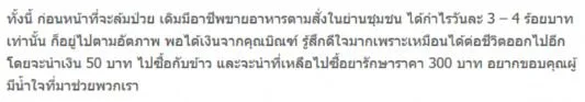 ยอมรับว่า ดีใจที่ยังมีคนมองมาถึงคนในพื้นที่แออัด ทั้งนี้ทางครอบครัว จะวางแผนกับเงินจำนวน 500 บาท ที่ได้จากพี่ท็อป พี่ไทด์ โดยจะนำเงินดังกล่าวไปซื้อไข่ไก่ พร้อมด้วยมาม่า เพื่อมาประกอบอาหารกินไปวัน ๆ โดยคาดว่า 500 บาท จะใช้เป็นเงินทุนในการซื้ออาหารได้ 2 วัน โดยเฉลี่ยจะใช่จ่ายมื้อละ 100 บาทต่อมื้อ เพื่อประกอบอาหารให้ได้ทั่งถึงกันทั้งครอบครัว ทั้งนี้เมนูที่จะทำคงเป็นทอดไข่เจียว มาม่าต้ม มาม่าผัด