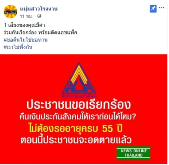ล่าสุด เมื่อวันที่ 10 เพจ หนุ่มสาวโรงงาน ได้โพสต์ข้อความระบุว่า 1 เสียงของคุณมีค่า ร่วมกันเรียกร้อง พร้อมติดแฮชแท็ก ขอคืนไม่ใช่ขอทาน เราไม่ทิ้งกัน