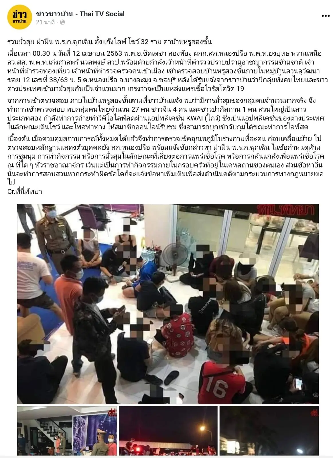 รวบมั่วสุม ฝ่าฝืน พ.ร.ก.ฉุกเฉิน ตั้งแก๊งไลฟ์ โชว์ 32 ราย คาบ้านหรูสองชั้น เมื่อเวลา 00.30 น.วันที่ 12 เมษายน 2563 พ.ต.อ.ชิดเดชา สองห้อง ผกก.สภ.หนองปรือ พ.ต.ท.ยงยุทธ หวานเหนือ สว.สส. พ.ต.ท.เก่งศาสตร์ นวลพงษ์ สวป.พร้อมด้วยกำลังเจ้าหน้าที่ตำรวจปราบปรามอาชญากรรมข้ามชาติ เจ้าหน้าที่ตำรวจท่องเที่ยว เจ้าหน้าที่ตำรวจตรวจคนเข้าเมือง เข้าตรวจสอบบ้านหรูสองชั้นภายในหมู่บ้านสวนสุวัฒนา ซอย 12 เลขที่ 38/63 ม. 5 ต.หนองปรือ อ.บางละมุง จ.ชลบุรี หลังได้รับแจ้งจากชาวบ้านว่ามีกลุ่มทั้งคนไทยและชาวต่างประเทศเข้ามามั่วสุมกันเป็นจำนวนมาก เกรงว่าจะเป็นแหล่งแพร่เชื้อไวรัสโควิด 19