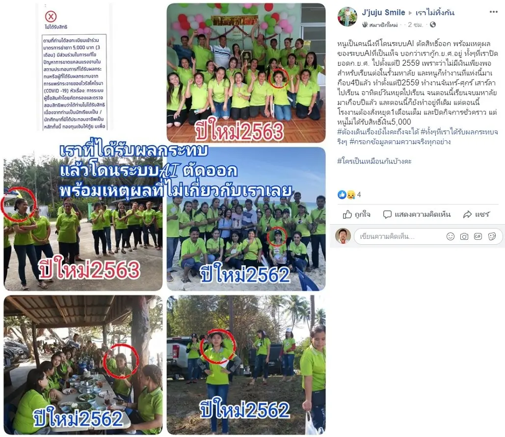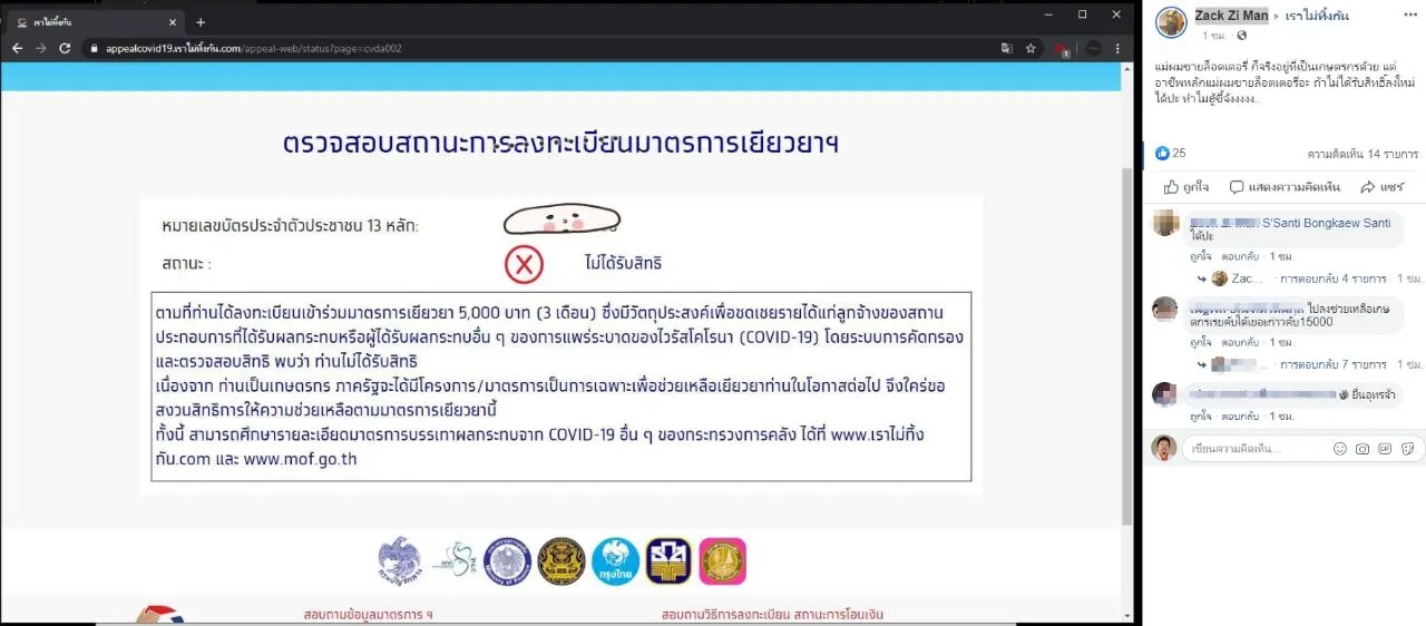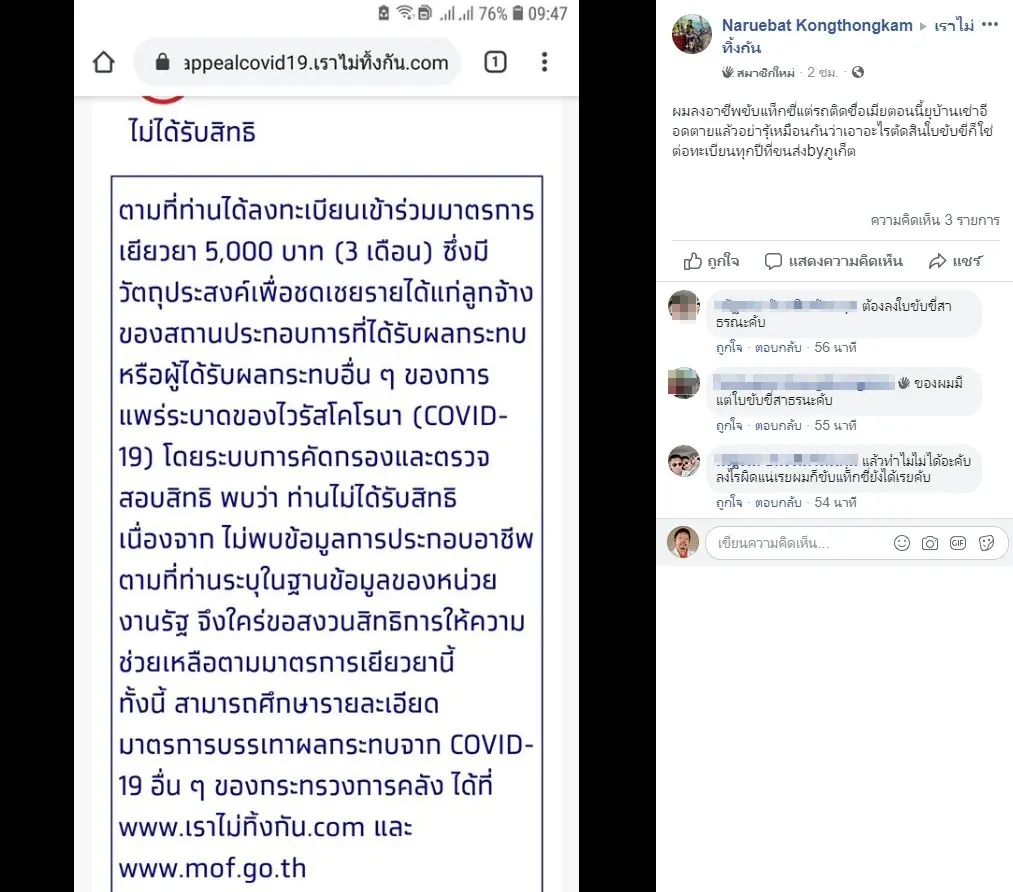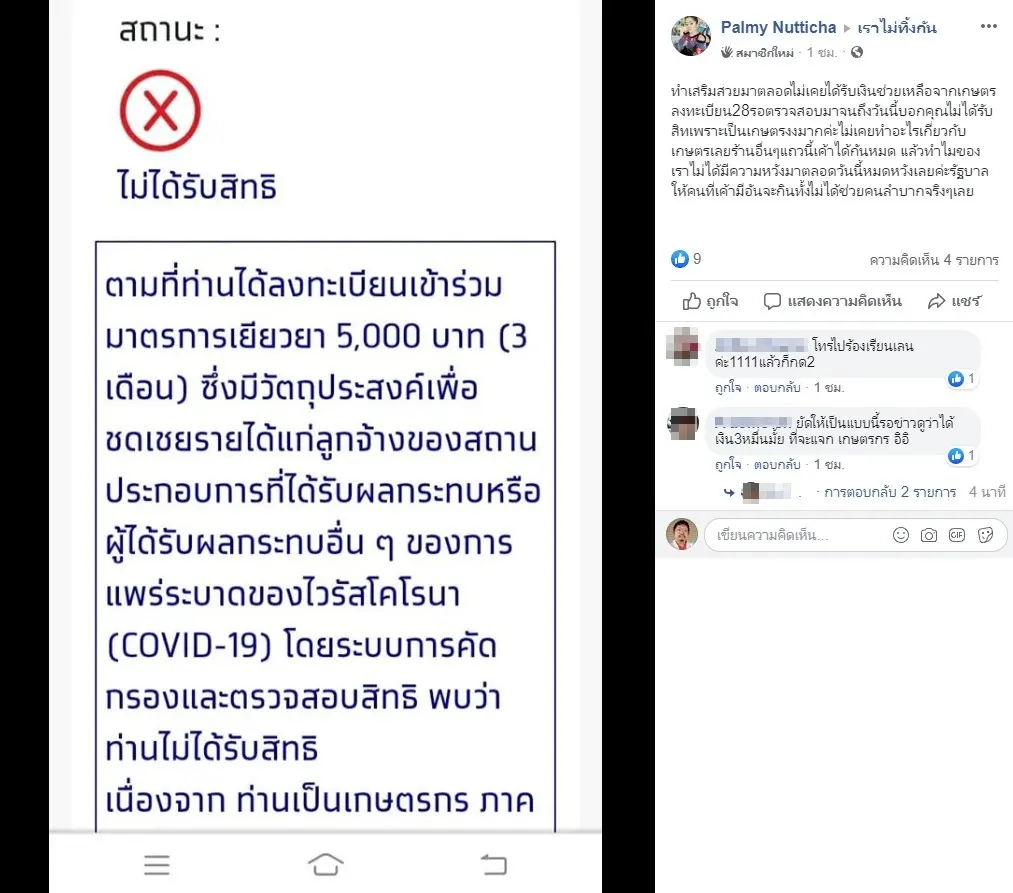 - ไม่ได้รับสิทธิ์เพราะเป็นนักเรียน นักศึกษา และมีการกู้ยืมเงิน กยศ. ซึ่งในความเป็นจริงผู้ลงทะเบียนขายของอยู่ตลาดนัด- ผู้ลงทะเบียนเปิดร้านทำผมมา 20 ปี ต้องปิดให้บริการตามคำสั่งรัฐ แต่ในระบบแจ้งว่า ผู้ลงทะเบียนเป็นเกษตรกร