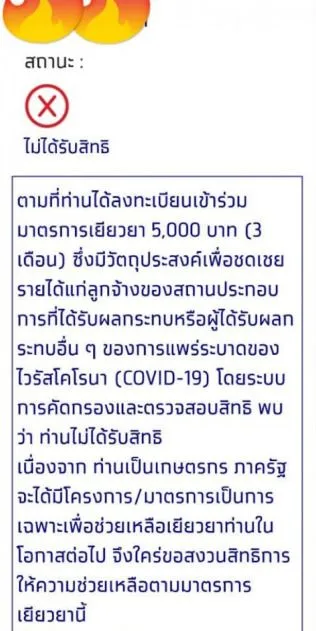 ล่าสุด ปรากฏว่ามีชาวโซเชี่ยลจำนวนมาก เช็คสถานะว่า ไม่ผ่าน พร้อมเหตุผล โดยผู้ใช้เฟสบุ๊ครายหนึ่งได้โพสต์ข้อความระบุว่า ขอสอบถามหน่อยเป็นคนขายของตลาดนัดแต่หมดสิทธิ์เฉย บอกว่าเป็นเกษตรกรแต่ไม่ได้เป็นนะ ข้อขอมูลผู้รู้หน่อยค่ะ