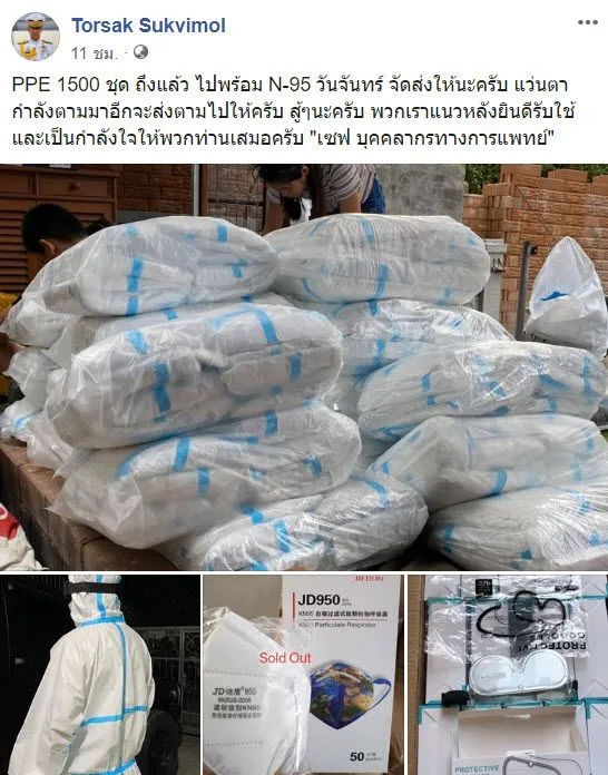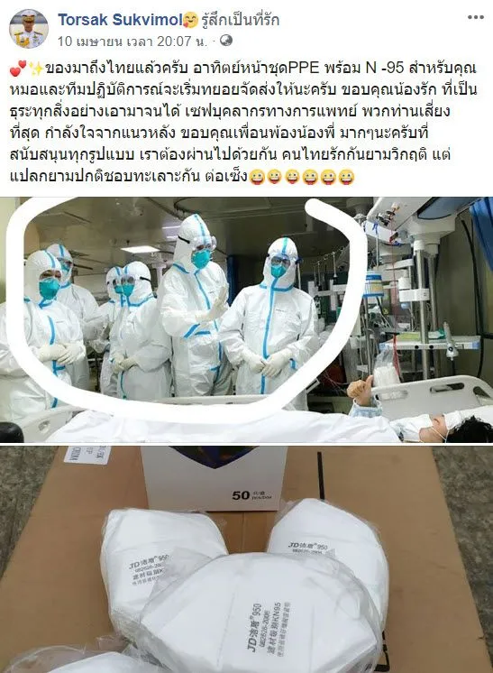 ดยก่อนหน้านั้น รองฯต่อศักดิ์ ได้แจ้งข่าวผ่านหน้าไทม์ไลน์ของตัวเองว่า “ของมาถึงไทยแล้วครับ อาทิตย์หน้าชุด PPE พร้อม N -95 สำหรับคุณหมอและทีมปฏิบัติการณ์จะเริ่มทยอยจัดส่งให้นะครับ ขอบคุณน้องรัก ที่เป็นธุระทุกสิ่งอย่างเอามาจนได้ เซฟบุคลากรทางการแพทย์ พวกท่านเสี่ยงที่สุด กำลังใจจากแนวหลัง ขอบคุณเพื่อนพ้องน้องพี่ มากๆ นะครับที่สนับสนุนทุกรูปแบบ เราต้องผ่านไปด้วยกัน คนไทยรักกันยามวิกฤต แต่แปลกยามปกติชอบทะเลาะกัน ต่อเซ็ง”