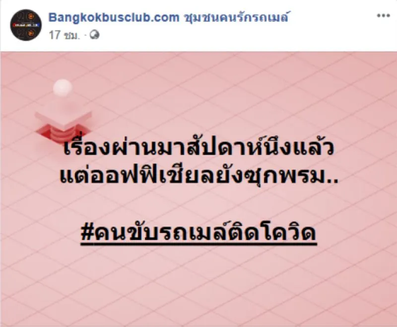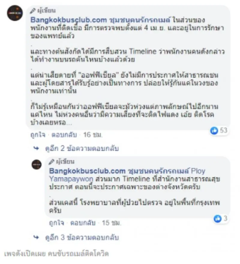 จากสถานการณ์ที่เกิดขึ้นในปัจจุบัน โดยทางรัฐออกมาตราการช่วยเหลือ ขอให้ความร่วมมือต่างๆนาๆ จนพบผู้ติดน้องลงอย่างเห็นได้ชัด แต่ก็ต้องระวังตัวเองอยู่ดีในการใช้ชีวิตในสังคมร่วมกันคนอื่น ล่าสุดทางเพจเฟซบุ๊กชื่อ Bangkokbusclub.com ชุมชนคนรักรถเมล์ ได้โพสต์ข้อความโดยได้ระบุข้อความว่า เรื่องผ่านมาสัปดาห์นึงแล้ว แต่ออฟฟิเชียลยังซุกพรม คนขับรถเมล์ติดcovid19 จากนั้น ได้ระบุข้อความเพิ่มเติมว่า ในส่วนของพนักงานที่ติด มีการตรวจพบตั้งแต่ 4 เมษายน และอยู่ในการรักษาของแพทย์แล้ว และทางต้นสังกัดได้มีการสืบสวน Timeline ว่าพนักงานคนดังกล่าว ได้ทำงานบนรถคันไหนบ้างแล้วด้วย