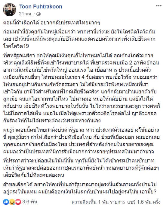 ล่าสุดผู้ใช้เฟซบุ๊ก Toon Fuhtrakoon ซึ่งเป็นคนไทยที่อาศัยอยู่ในสหรัฐอเมริกาได้โพสต์ข้อความระบายลงในเฟซบุ๊กส่วนตัวว่า “ตอนนี้ถ้าเลือกได้ อยากกลับประเทศไทยมากๆ ก่อนหน้านี้ยังคุยกันในหมู่เพื่อนๆ ว่า พวกเรานี้เก่งนะ ยังไม่ใครติดโควิดกันเลย เช้าวันนี้คนที่มีพระคุณกับชีวิตผมและครอบครัวมากๆ เพิ่งเสียชีวิตจากโรคโควิด19