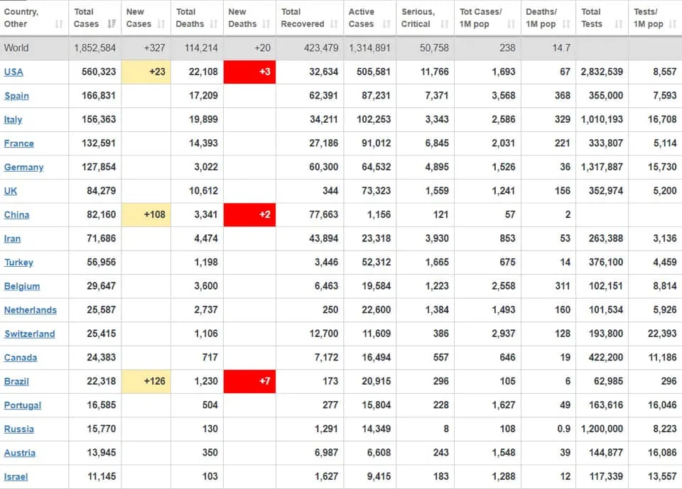 โดยสหรัฐอเมริกายังคงครองอันดับหนึ่งของโลกที่มียอดผู้ป่วยสะสมพุ่งไปถึง 560,323 ราย รองลงมาคือสเปนที่มียอดผู้ป่วยสะสมที่ 166,831 รายอันดับสามเป็นอิตาลีอยู่ที่ 156,363 ราย อันดับสี่เป็นฝรั่งเศสที่ 132,591 ราย อันดับที่ห้าตกเป็นของเยอรมันที่ 127,854 ราย อันดับที่หกเป็นสหราชอาณาจักรที่ 84,279 ราย อันดับเจ็ดเป็นจีนมีผู้ป่วยสะสมอยู่ที่ 82,160 ราย อันดับที่แปดเป็นอิหร่านที่ตัวเลข 71,686 ราย อันดับที่เก้าเป็นตุรกีที่ 56,956 ราย และอันดับสิบเป็นเบลเยียมที่ 29,647 คน (ข้อมูล ณ วันที่ 13 เมษายน 2563 เวลา 08.40 น.)