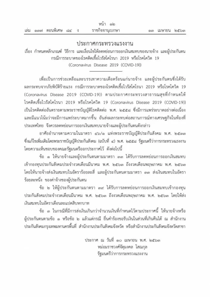 เว็บไซต์ราชกิจจานุเบกษา เผยแพร่ประกาศกระทรวงแรงงาน เรื่องกำหนดหลักเกณฑ์ วิธีการ และเงื่อนไขให้ลดหย่อนการออกเงินสมทบของนายจ้าง และผู้ประกันตน กรณีการระบาดของโรคติดเชื้อไวรัสโคโรนา 2019 หรือ COVID-19 มีใจความ ดังนี้