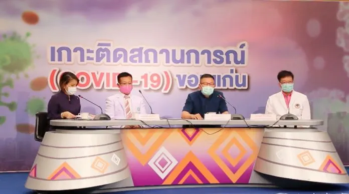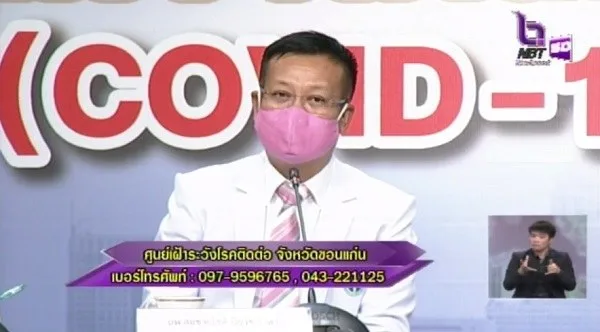 ในวันนี้ (14 เม.ย. 63) เมื่อเวลา 13.30 น. ที่สถานีวิทยุโทรทัศน์แห่งประเทศไทย จ.ขอนแก่น นายสมศักดิ์ จังตระกุล ผวจ.ขอนแก่น พร้อมด้วย นพ.สมชายโชติ ปิยวัชร์เวลา นายแพทย์สาธารณสุขจังหวัดขอนแก่น และ นพ.ชาญชัย จันทร์วรชัยกุล ผู้อำนวยการโรงพยาบาลขอนแก่น ร่วมกันแถลงข่าวผู้ติดเชื้อไวรัสโควิด-19 รายที่ 5 ของจังหวัดขอนแก่น ซึ่งเป็นหญิงวัย 63 ปี ชาวบ้านกุดน้ำใส หมู่ 1 ต.กุดน้ำใส อ.น้ำพอง จ.ขอนแก่น