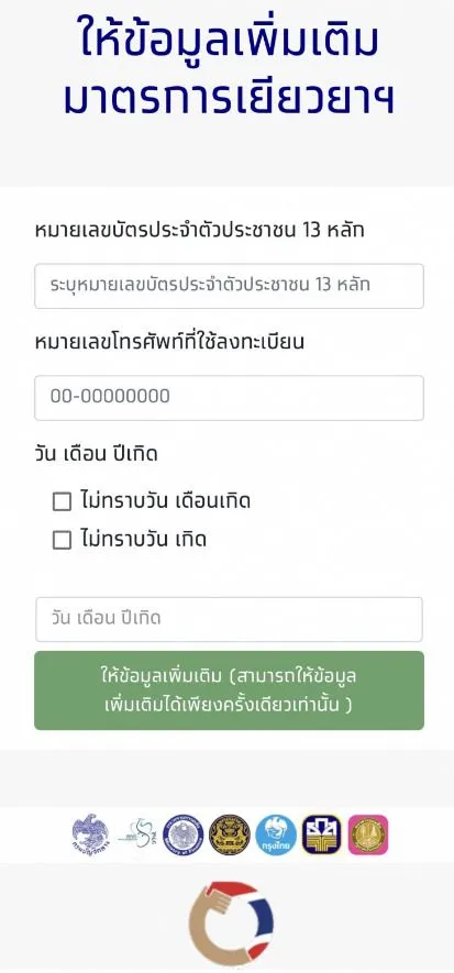 กรอกรายละเอียด หมายเลขบัตรประชาชนที่ใช้ลงทะเบียน 13 หลัก หมายเลขโทรศัพท์ที่ใช้ลงทะเบียน วันเดือนปีเกิด เพื่อตรวจสอบสิทธิ์การใช้เมนู ให้ข้อมูลเพิ่มเติม