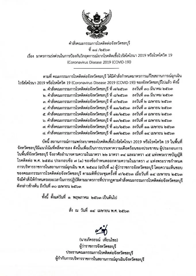 วันที่ 15 เม.ย. ผู้สื่อข่าวรายงานว่า นายภัครธรณ์ เทียนไชย ผู้ว่าราชการจังหวัดชลบุรี ได้ลงนามในหนังสือ คำสั่งคณะกรรมการโรคติดต่อจังหวัดชลบุรี ที่ 18/2563 เรื่อง มาตราการเร่งด่วนในการป้องกันวิกฤตการณ์จากโวคติดเชื้อโควิด19