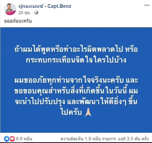 "ถ้าผมได้พูดหรือทำอะไรผิดพลาดไป หรือกระทบกระเทือนจิตใจใครไปบ้าง ผมขออภัยทุกท่านจากใจจริงนะครับ และขอขอบคุณสำหรับสิ่งที่เกิดขึ้นในวันนี้ ผมจะนำไปปรับปรุงและพัฒนาให้ดียิ่งๆ ขึ้นไปครับ" ผู้กองเบนซ์ โพสต์