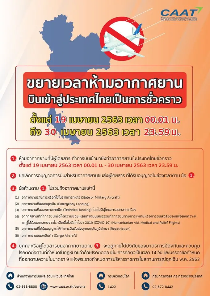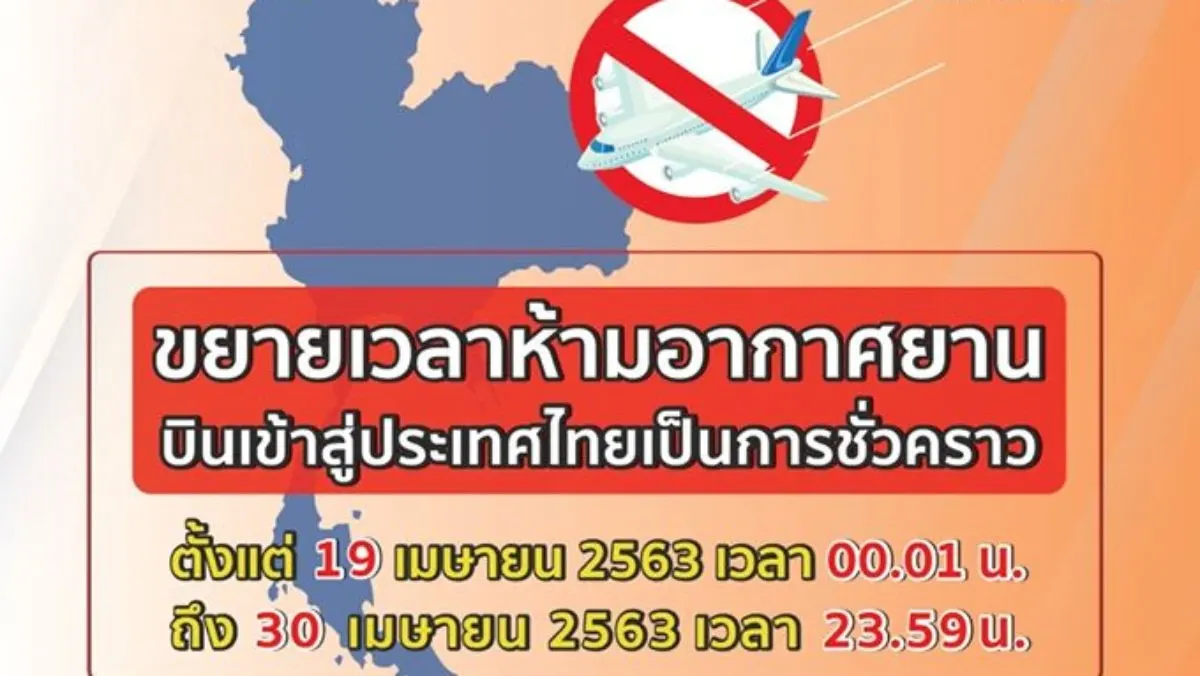 ขยายเวลาห้ามอากาศยานทำการบินเข้าสู่ประเทศไทยเป็นการชั่วคราว ไปจนถึงวันที่ 30 เมษายน