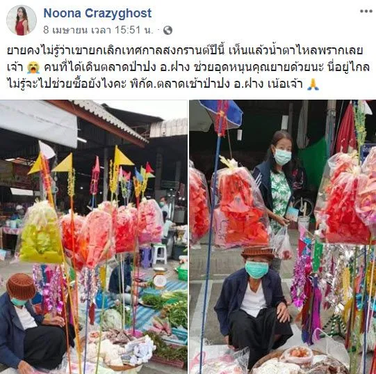 เป็นอีกหนึ่งเรื่องราวที่ทำเอาชาวเน็ตต่างเข้ามาแสดงความคิดเห็นกันเป็นจำนวนมาก เมื่อผู้ใช้เฟซบุ๊กที่ใช้ชื่อ Noona Crazyghost ได้ออกมาโพสต์ภาพของคุณยายท่านหนึ่งที่นั่งขายตุง12 นักษัตร ที่เอาไว้ปักบนเจดีย์ทราย ตามประเพณีขนทรายเข้าวัดของชาวเหนือ ในช่วงเทศกาลสงกรานต์ โดยไม่รู้ว่าปีนี้เค้ายกเลิกเทศกาลสงกรานต์ ซึ่งจากโพสต์นั้นได้ระบุว่า
