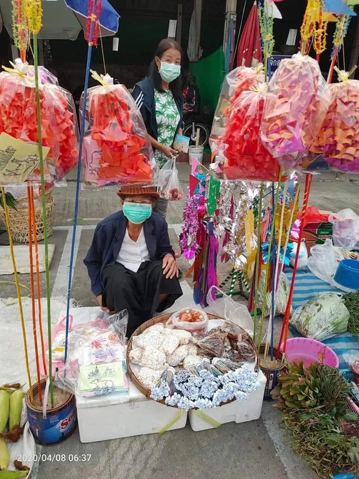 ยายนั่งขายตุง รอคนซื้อไปปักทราย โดย "ไม่รู้ว่าปีนี้ยกเลิกสงกรานต์"