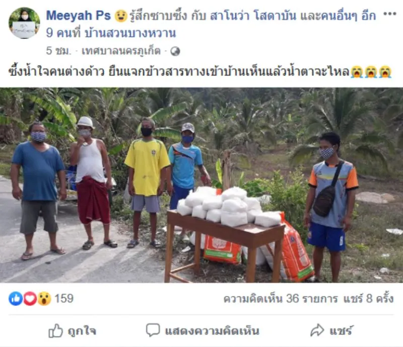 วันที่ 14 เมษายน ผู้ใช้เฟซบุ๊กชื่อ Meeyah Ps ได้มีการโพสต์เรื่องราวสุดประทับใจ หลังจากที่เขาได้พบกับกลุ่มแรงงานชาวพม่า ที่ช่วยกันเรี่ยไรเงินซื้อข่าวสาร มายืนแจกที่ทางเข้าหมู่บ้านสวนบางหวาน จังหวัดภูเก็ต สร้างความซาบซึ้งใจเป็นอย่างมาก โดยหลังจากที่ได้มีการโพสต์เรื่องราวออกไป ก็มีชาวโซเีชยลเข้ามาแสดงความคิดเห็นชื่นชม