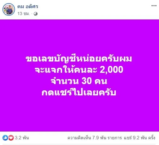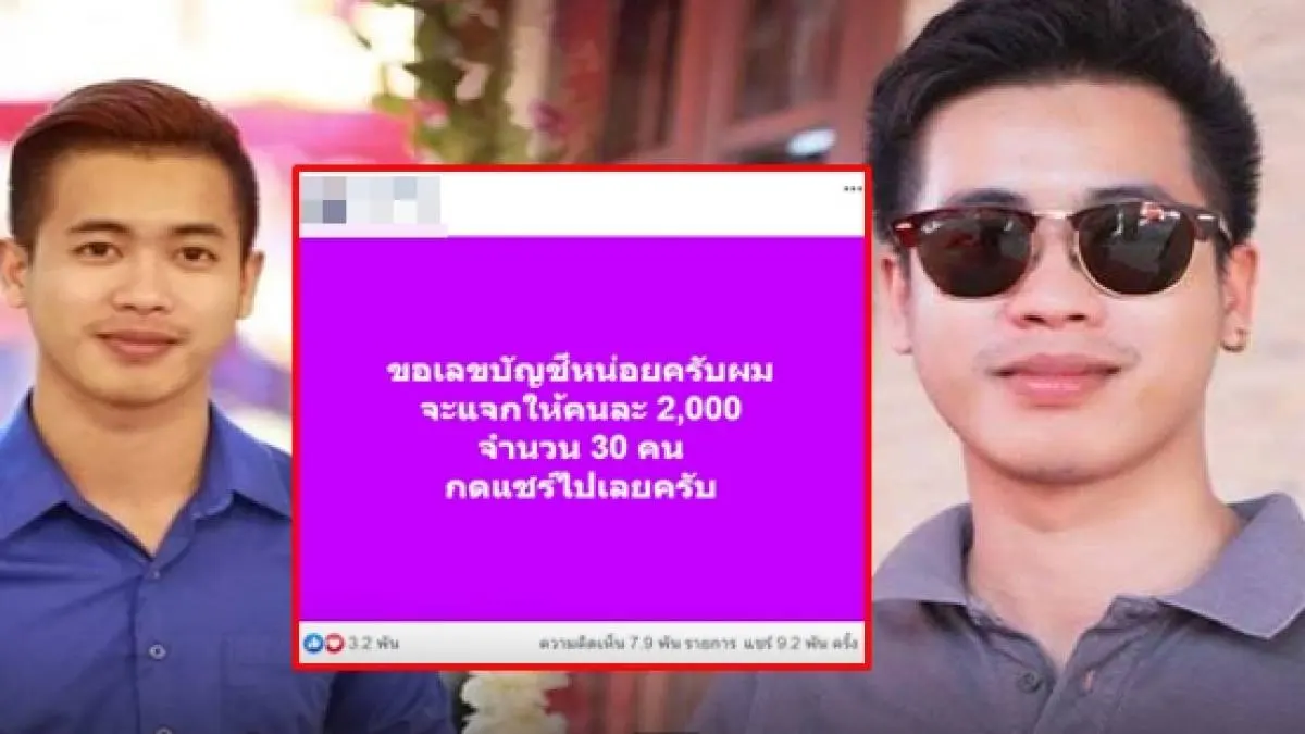 เป็นเงินจำนวน 2,000 บาท ให้กับคนที่แชร์โพสต์ออกไป จำนวน 30 คน