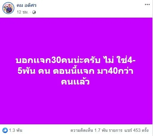 ทั้งนี้หนุ่มยังโพสต่อว่า บอกเเจก30คนน่ะครับ ไม่ ใช่4-5พัน คน