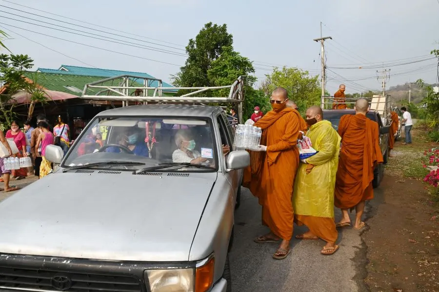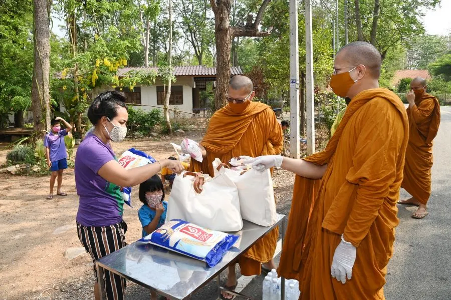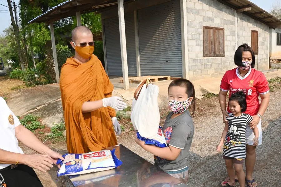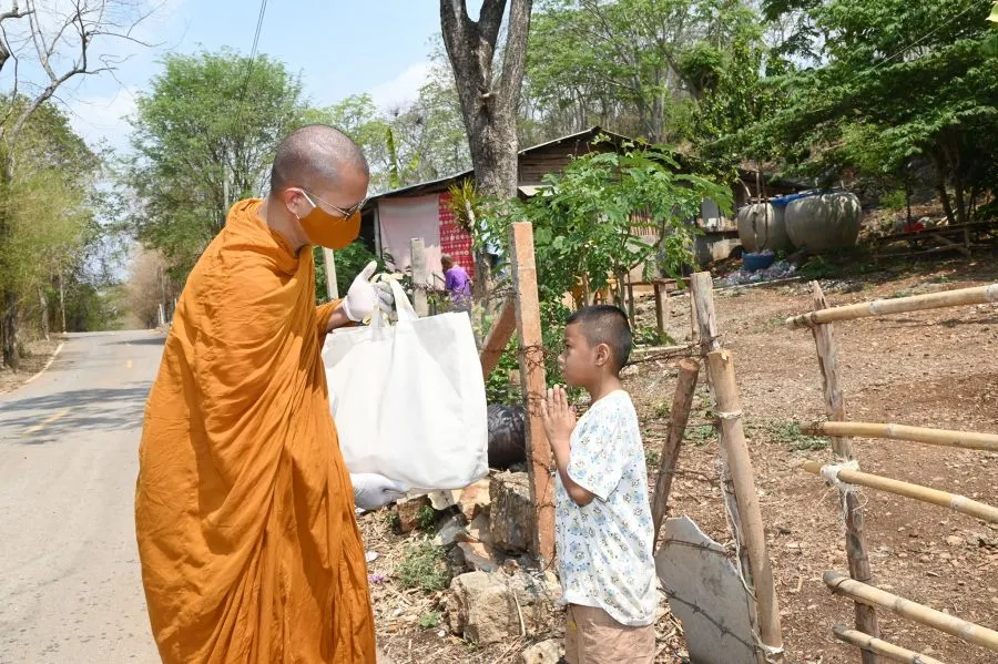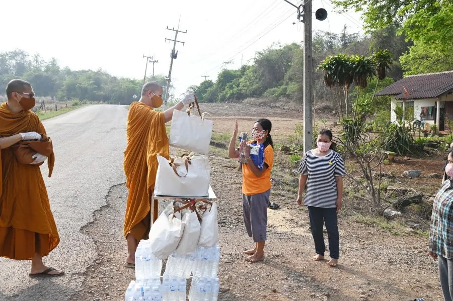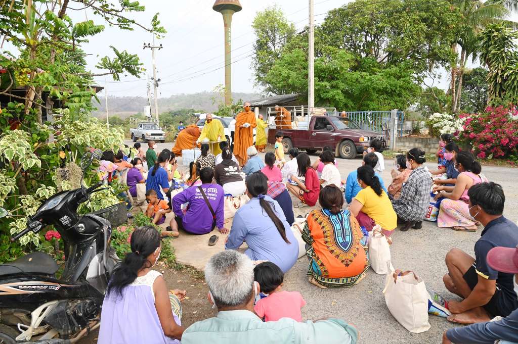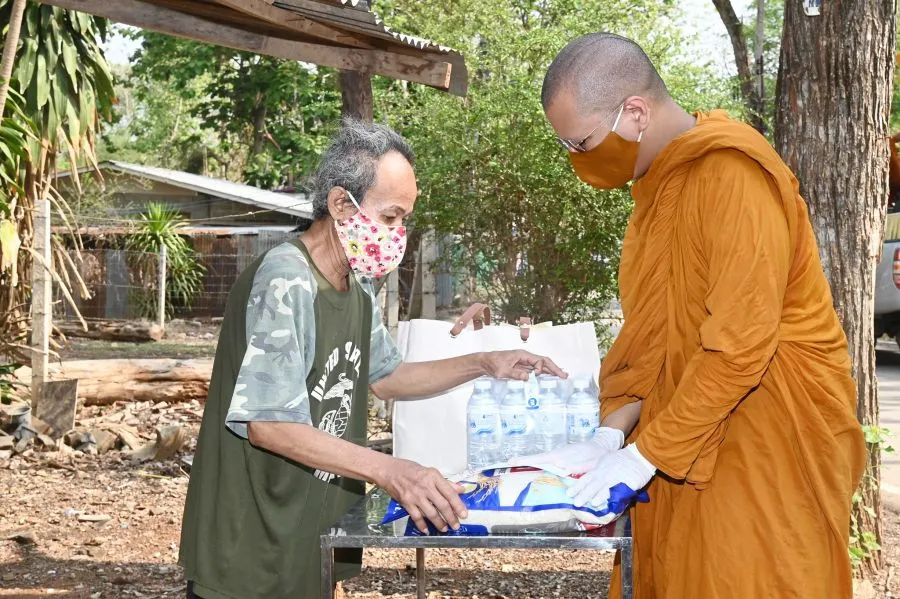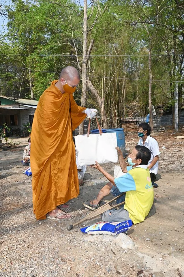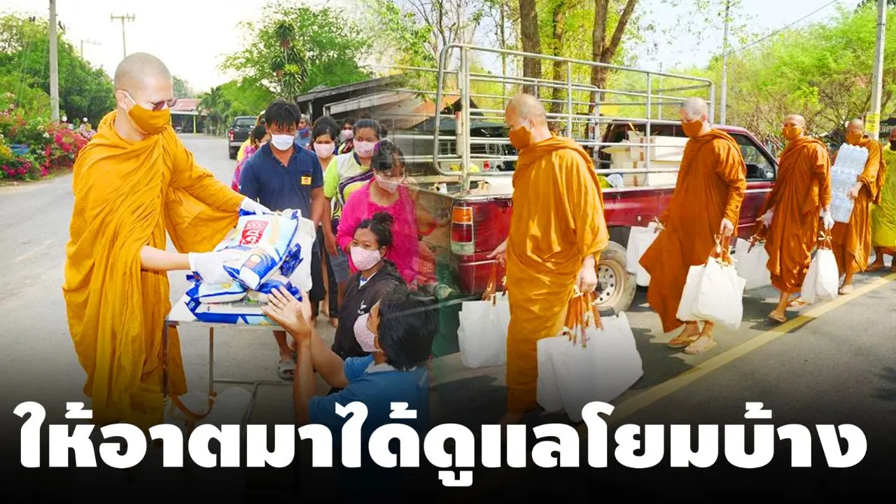 พลังแห่งเมตตาธรรมค้ำจุนโลก พระสงฆ์ออกแจกทานบรรเทาทุกข์ชาวบ้าน พระอาจารย์คม อภิวโร เมตตาประพรมน้ำพระพุทธมนต์ตั้งแต่ภายในวัดออกไปนอกประตูวัด จากนั้นจึงเปลี่ยนให้พระมหาวุฒิมา ปญฺญาวุฑฺโฒ เป็นผู้ประพรมน้ำพระพุทธมนต์ให้พี่น้องชาวบ้านต่อไป