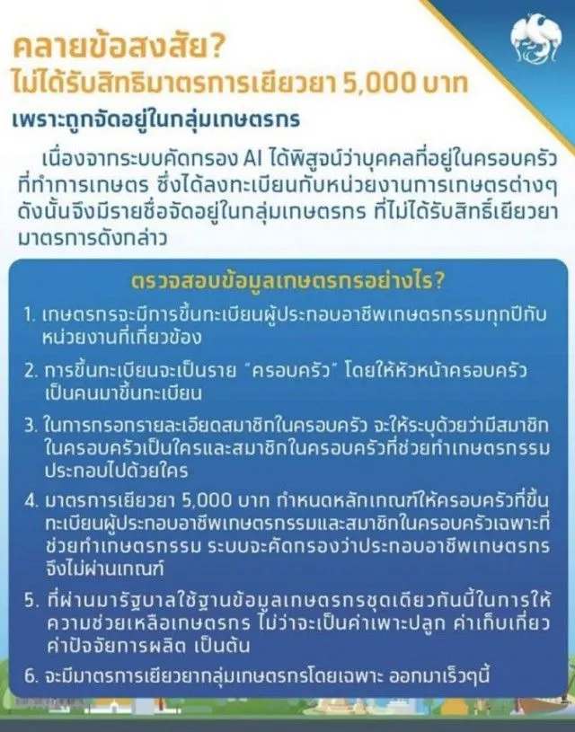 เป็นอีกหนึ่งเรื่องราวที่ใครหลายคนต่างสงสัย ล่าสุด นายลวรณ แสงสนิท โฆษกกระทรวงการคลัง ได้ออกมาชี้แจงเพิ่มเติมว่า เกษตรกรจะมีการขึ้นทะเบียนผู้ประกอบอาชีพเกษตรกรรมทุกปี กับหน่วยงานที่เกี่ยวข้อง โดยการขึ้นทะเบียนจะเป็นรายครอบครัว โดยให้หัวหน้าครอบครัวเป็นคนมาขึ้นทะเบียน และในการกรอกรายละเอียดสมาชิกในครอบครัว ซึ่งจะให้ระบุด้วยว่ามีสมาชิกในครอบครัวกี่คน เป็นใครบ้าง และสมาชิกในครอบครัวที่ช่วยทำเกษตรกรรมมีกี่คน คือใครบ้าง ที่ผ่านมารัฐบาลใช้ฐานข้อมูล ชุดเดียวกันนี้ ในการให้ความช่วยเหลือเกษตรกร ไม่ว่าจะเป็นค่าเพาะปลูก ค่าเก็บเกี่ยว ค่าปัจจัยการผลิต เป็นต้น