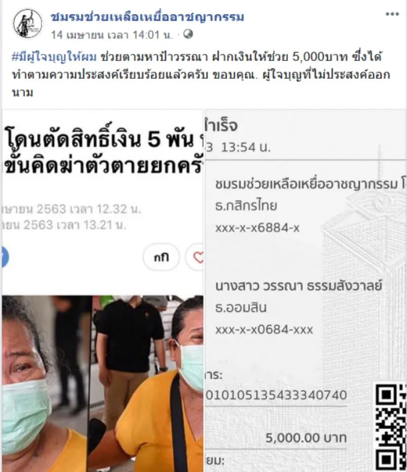 ล่าสุดเมื่อวันที่ 14 เมษายน 2563 ที่ผ่านมา เพจเฟซบุ๊ก ชมรมช่วยเหลือ ได้โพสต์ข้อความระบุว่า มีผู้ใจบุญให้ผม ช่วยตามหาป้าวรรณา ฝากเงินให้ช่วย 5000 บาท ซึ่งได้ทำตามความประสงค์เรียบร้อยแล้วครับ ขอบคุณ ผู้ใจบุญที่ไม่ประสงค์ออกนาม