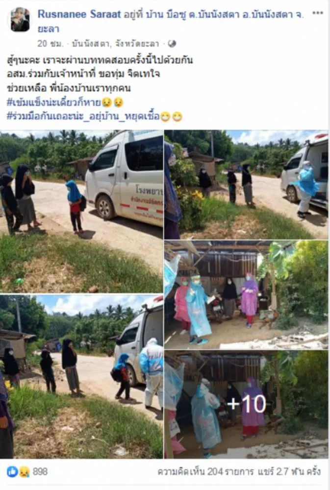 ทั้งนี้รายงานระบุว่า อสม. ร่วมกับหน้านำรถโรงบาลเข้ามารับเด็กหญิงวัย 4 ขวบ หลังพบว่าติด covid-19 ที่บันนังสตา จ.ยะลา เมื่อวานนี้ 15 เมษายน 2563 หลังจากที่ภาพดังกล่าวถูกเผยแพร่ออกไป ได้มีผู้เข้ามาแสดงความคิดเห็นเป็นจำนวนมากว่า
