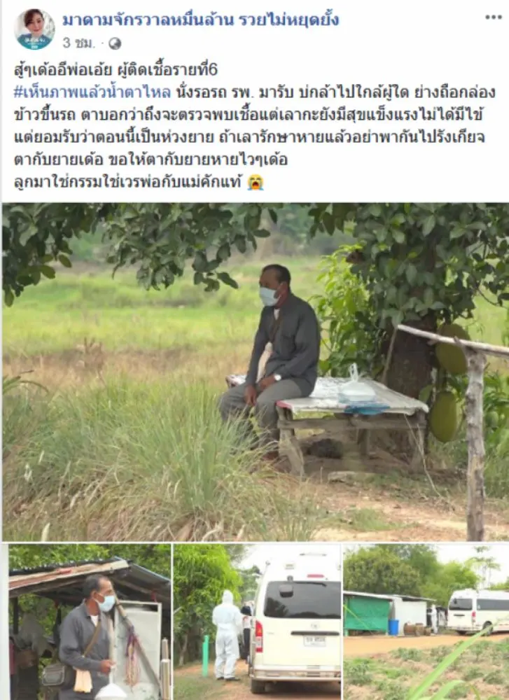 วันที่ 16 เมษายน 2563 ทีมข่าว siamnews ได้รับรายงานว่า โลกออนไลน์มีการส่งต่อภาพเรื่องราวที่น่าเห็นใจของผู้ใช้เฟซบุ๊กชื่อ มาดามจักรวาลหมื่นล้าน รวยไม่หยุดยั้ง ได้โพสต์ภาพพร้อมระบุข้อความว่า สู้ๆเด้อพ่อเอ้ย ผู้ติด CD รายที่6 เห็นภาพแล้วร้อง นั่งรอรถ รพ มารับ บ่กล้าไปใกล้ผู้ใด ย่างถือกล่องข้าวขึ้นรถ ท่านบอกว่าถึงจะตรวจพบแต่เลากะยังมีสุขแข็งแรงไม่ได้มีไข้ แต่ยอมรับว่าตอนนี้เป็นห่วงยาย ถ้าเลารักษาหายแล้วอย่าพากันไปกลัวตากับยายเด้อ ขอให้ตากับยายหายไวๆเด้อ ลูกมาใช่กรรมใช่เวรพ่อกับแม่คักแท้