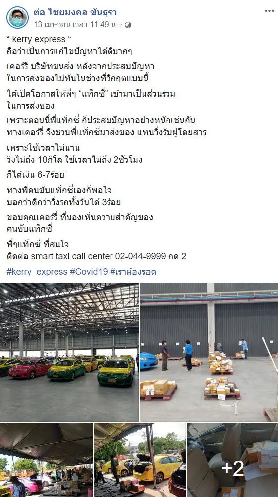 ล่าสุด (16 เมษายน 2563) เฟซบุ๊ก Smart Taxi.,Ltd ได้เผยการแก้ปัญหาของ เคอรี่ ที่เปิดโอกาสให้คนขับแท็กซี่ วิ่งรับส่งของด้วย ซึ่งนอกจากจะแก้ปัญหาเรื่องการส่งของล่าช้าแล้ว ยังช่วยให้พี่ ๆ แท็กซี่ที่เดือดร้อนเพราะไม่ค่อยมีผู้โดยสาร ได้หารายได้อีกทาง