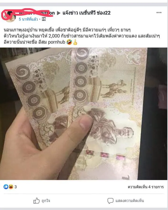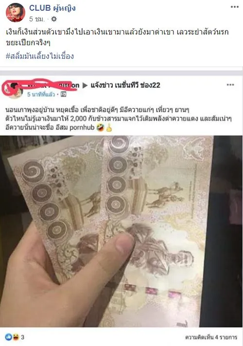 ด่ายับ! หนุ่มโพสโชว์เงิน พร้อมแคปชั่น "นอนเกาพุงอยู่บ้าน อยู่ดีๆมีควายมาให้เงิน 2000"