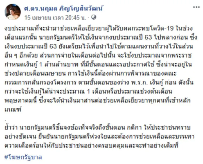 เมื่อวันที่ 15 เมษายน 2563 ที่ผ่านมา ศาสตราจารย์ นฤมล ภิญโญสินวัฒน์ โฆษกประจำสำนักนายกรัฐมนตรี ได้มีการโพสต์ข้อความผ่านเฟซบุ๊ก ศ.ดร.นฤมล ภิญโญสินวัฒน์ โดยได้ระบุว่ารัฐบาลมีงบประมาณเพียงพอในการจ่ายเงินช่วยเหลือ แต่จำเป็นต้องกู้เงินเพื่อนำมาใช้ประโยชน์เพิ่มขึ้น พร้อมช่วยเหลือทุกคนที่เข้าหลักเกณฑ์