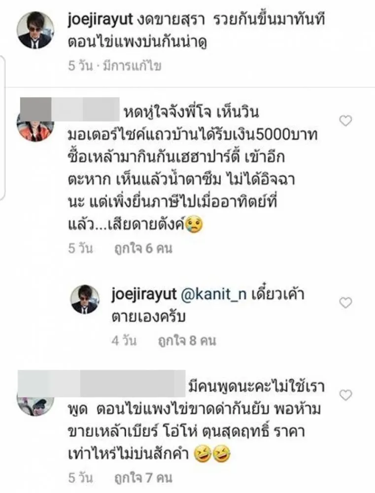 นักร้องชื่อดัง จิรายุส วรรธนะสิน โจ นูโว เจ้าตัวโพสต์ภาพผู้คนไปกักตุนเหล้าตามห้างสรรพสินค้าเป็นจำนวนมาก ก่อนวันที่รัฐสั่งห้ามขายเพียง 1 วัน จากนั้นได้มีคนเข้าไปคอมเมนต์มากมาย เพื่อบอกเล่าสภาวะที่กำลังเกิดขึ้นกับคนไทย ทั้งเรื่องการค้าขายไม่ได้ ตกงาน ไม่มีงานทำ หลายคนถึงขนาดตั้งคำถามว่า พรุ่งนี้จะเอาอะไรกิน