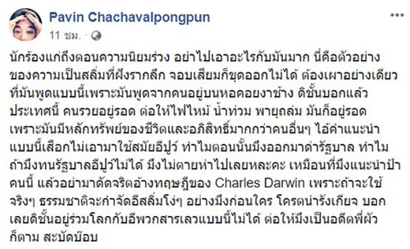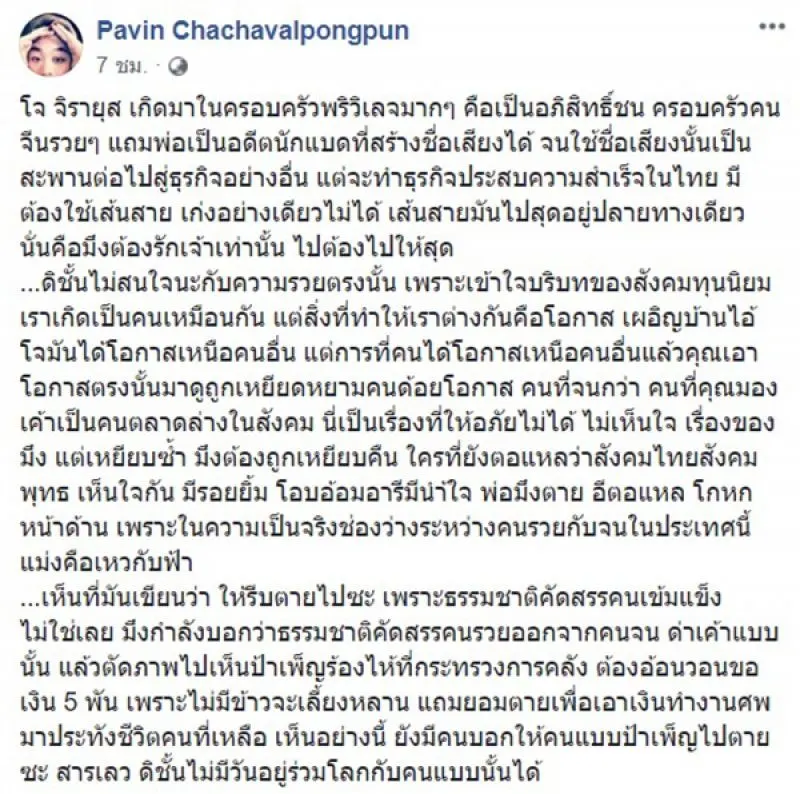 ปวิน ยังกล่าวอีกว่า คำแนะนำแบบนี้ทำไมไม่เอามาใช้สมัยรัฐบาลยิ่งลักษณ์ ทำไมตอนนั้นถึงออกมาด่ารัฐบาล ถ้าทนรัฐบาลยิ่งลักษณ์ไม่ได้ ทำไมไม่ตายไปเลย เหมือนที่แนะนำป้าคนนี้ให้ไปตาย แล้วอย่ามาดัดจริตอ้างทฤษฎีของ ชาร์ลส์ ดาร์วิน เพราะถ้าจะใช้จริง ๆ ธรรมชาติจะกำจัดสลิ่มโง่ ๆ อย่างโจก่อนใคร น่ารังเกียจ บอกเลยว่าตนอยู่ร่วมโลกกับพวกสารเลวแบบนี้ไม่ได้ โจเกิดมาในครอบครัวที่เป็นอภิสิทธิ์ชน ครอบครัวคนจีนรวย ๆ แถมพ่อเป็นอดีตนักแบดที่สร้างชื่อเสียงได้ จนใช้ชื่อเสียงนั้นเป็นสะพานต่อไปสู่ธุรกิจอย่างอื่น แต่จะทำธุรกิจประสบความสำเร็จในไทย มันต้องใช้เส้นสาย เก่งอย่างเดียวไม่ได้