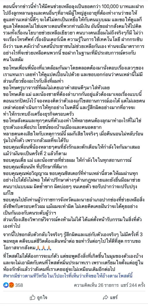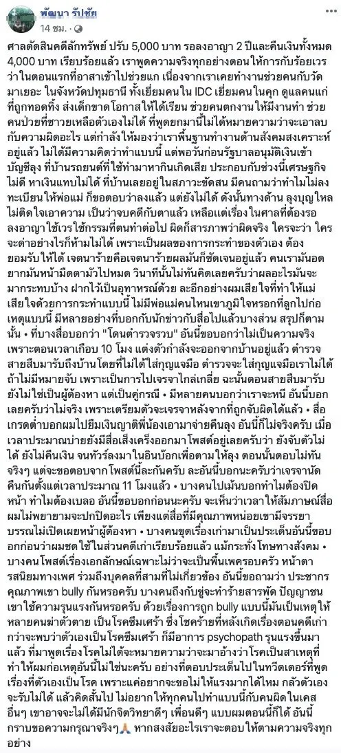 โพสต์ยาวเหยียด!โจรหนุ่มอมเงินลุง อ้างไม่ใช่ผู้ต้องหาแค่คู่กรณีลั่นทำความดีมาตลอดชีวิต จะทำแบบนี้กับตนไม่ได้ พร้อมเขียนสั่งสอนคนอื่น