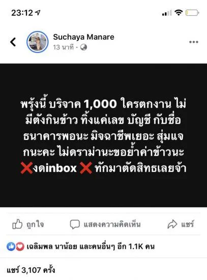 16 เมษา 2563 พรุ่งนี้ บริจาค 1,000 ใครตกงาน ไม่มีตังกินข้าว ทิ้งแค่เลข บัญชี กับชื่อธนาคารพอนะและขอย้ำค่าข้าวนะ งดinbox ทักมาตัดสิทธเลยจ้า